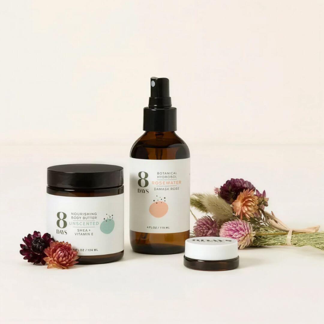 This natural skincare gift set from 8 Days Botanical Gifts features their best-selling Unscented Body Butter, Organic Pure Rosewater, and Calendula Lip Butter to hydrate, soothe, and protect delicate skin.