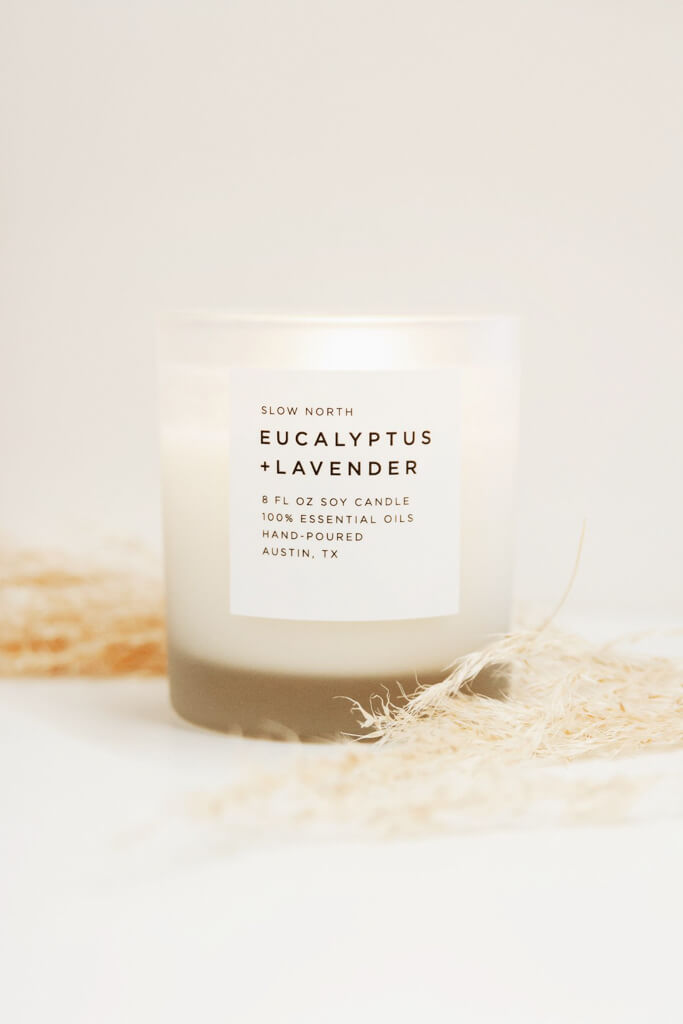 Breathe easy and unwind with the Slow North Eucalyptus + Lavender soy candle. This frosted soy candle captures the delicate sweetness of lavender and the freshness of eucalyptus to transform your space into a serene sanctuary. Great for lazy afternoons and relaxing nights.